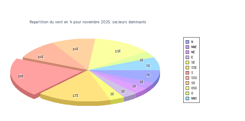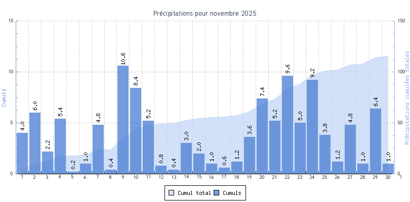 - Jour le plus chaud du mois : 5 novembre avec une moyenne journalière de : 16.4 °C