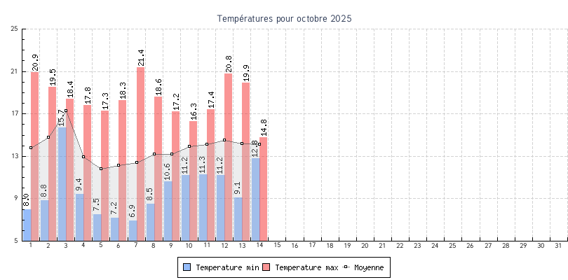 - Jour le plus froid du mois : 5 octobre avec une moyenne journalière de : 11.8 °C