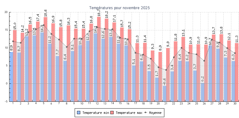 - Jour le plus froid du mois : 8 novembre avec une moyenne journalière de : 10.3 °C