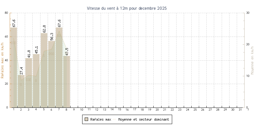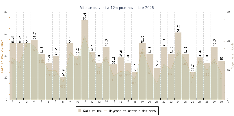 - Rafales la plus élevée à 12m : 72.4 km/h le 11 à 13:58