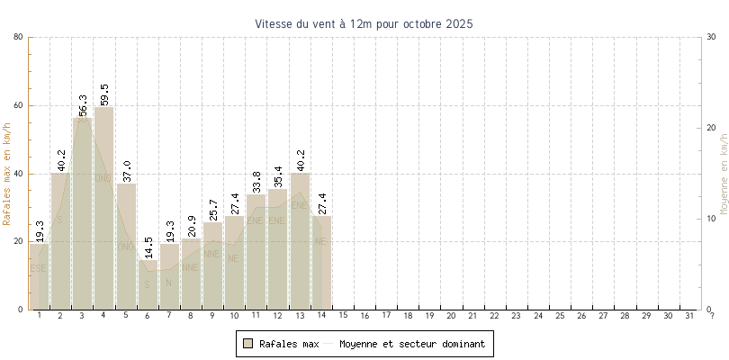 - Rafales la plus élevée à 12m : 59.5 km/h le 4 à 12:42
